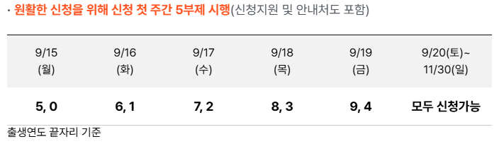 - 초기에는 출생연도 끝자리 기준 5부제로 운영 (9/15~9/19), 이후 누구나 신청 가능